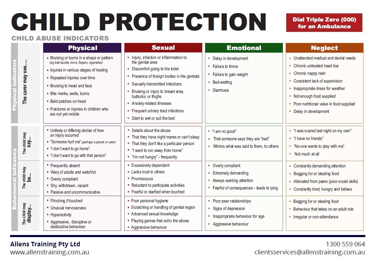 It is designed to build awareness and provide the education required to identify, respond, support and protect children and young people who are at risk of harm. It provides participants with an awareness of child abuse and neglect including the indicators of the different types and dynamics of abuse as they may apply to age, gender, disability, culture and sexuality.